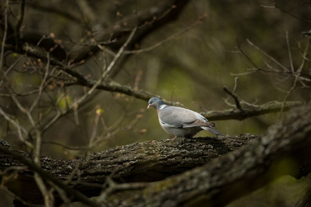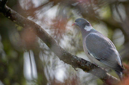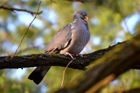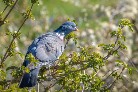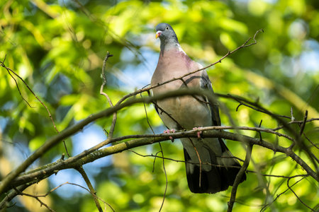 Close-up of a wood pigeon, columba palumbus, perched in a tree during spring season