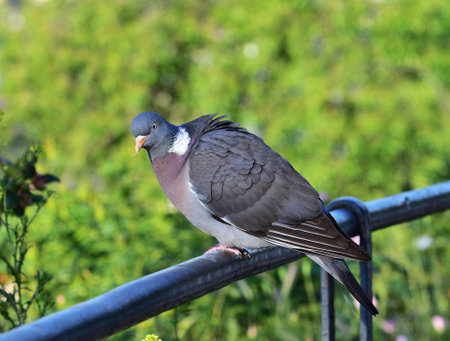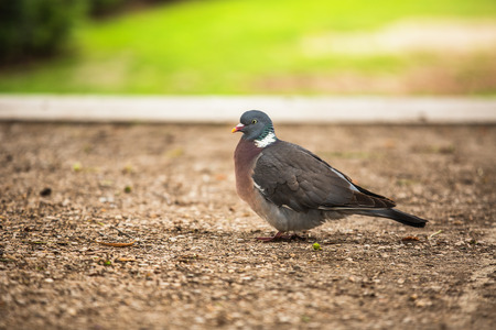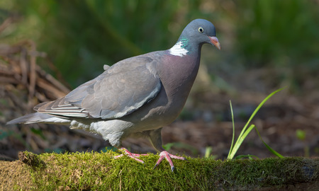 The common wood pigeon or woodpigeon (Columba palumbus) - grey with the white on its neck and wing and green and white patches on neck, and a pink patch on chest. The eye colour is a pale yellow