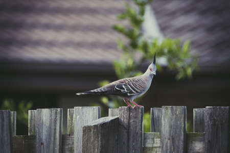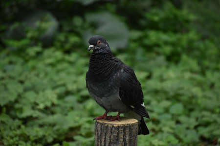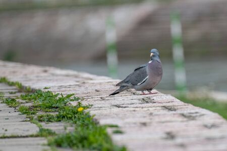 Beautiful closeup view of big common city feral pigeon (Columbidae) sitting on the stone fench in Stephens Green Green Park, Dublin, Ireland. Soft and selective focus
