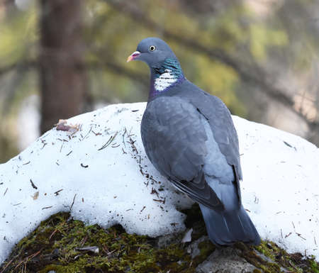 Common wood pigeon (Columba palumbus) sitting on a snowy rock in the forest.
