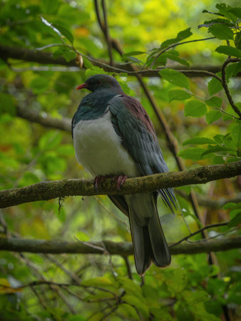 Close up of endemic Kereru New Zealand wood pigeon bird sitting on tree branch in Abel Tasman National Park South Island NZ