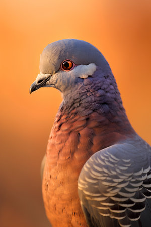 Portrait of a beautiful pigeon on a background of orange sunset.