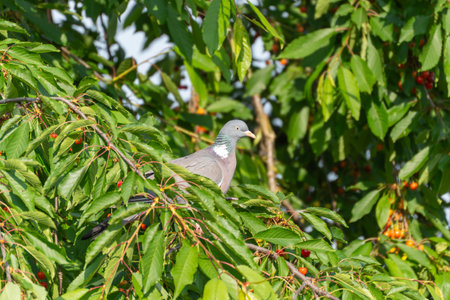 A pigeon is perched among cherry tree branches with ripening fruits. The bird is alert and surrounded by green foliage.