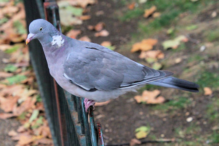Portrait of a pigeon on a background of autumn leaves. Selective focus.