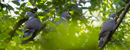 two common wood pigeons sitting together in a beautiful composition, preening their feathers, common birds of europe