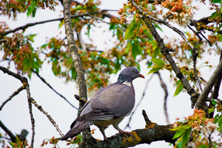 A closeup shot of a beautiful pigeon perched on the cherry tr
