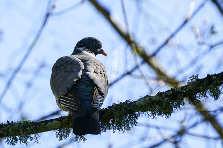 European stock dove, columba oenas, in a natural habitat on a lichen tree branch in the forest, blue sky background