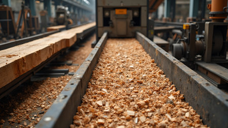 Industrial sawmill conveyor belts moving cut lumber wood chips scattered below