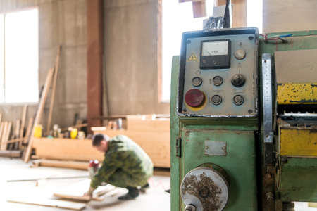 Sawdust near bench thicknesser and blurred carpenter in workshop