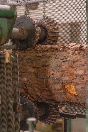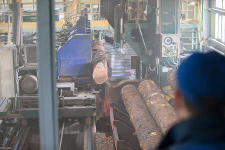 Industrial sawing of wood. Swing and processing boards at the sawmill. timber industry.