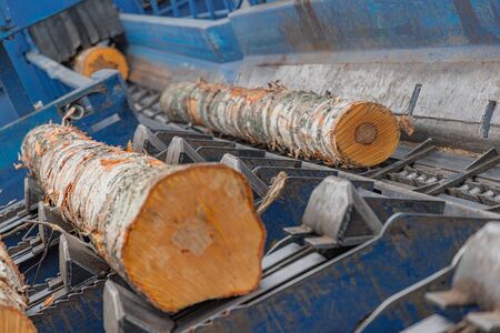 Automated log sorting line. Production of timber from wood. Woodworking. Machining logs. The logs in the sawmill are moving along a conveyor belt