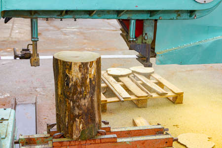 Worker in outdoor carpentry, workshop cuts the log into round ring boards using large industrial band saw.