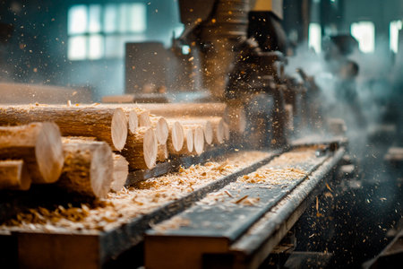 Carpenters working on a production line processing timber logs in a sawmill, ensuring quality and efficiency in lumber production