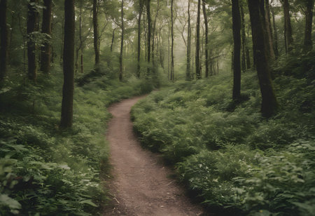 A path winds through a verdant forest, surrounded by tall trees and vibrant foliage. Sunlight filters through the canopy, creating a play of light and shadow. The composition focuses on the natural environment, likely suitable for illustrating themes of nature, travel, or environmental conservation, and various commercial purposes.