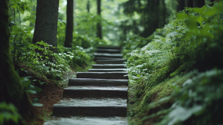 Discover a serene forest pathway lined with stone steps, surrounded by vibrant greenery and vibrant trees, perfect for hiking or quiet reflection in nature.