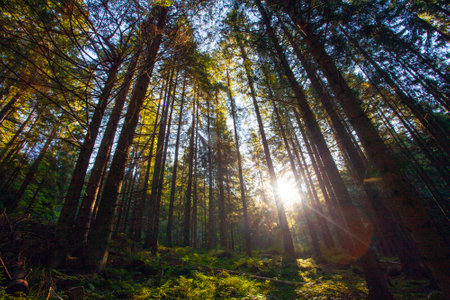 Fresh green forest in sunshine taken early morning in Carpathian mountains