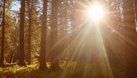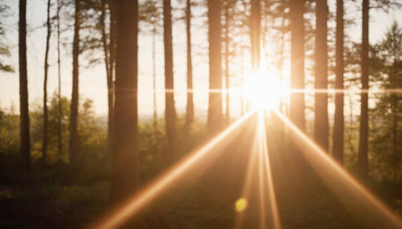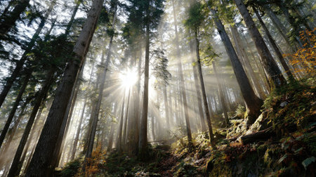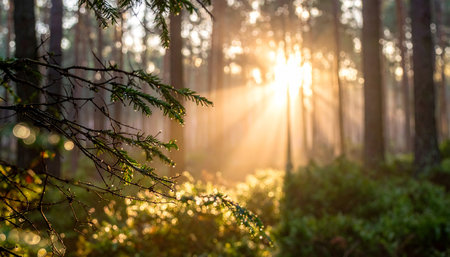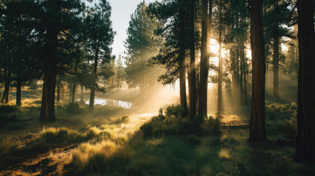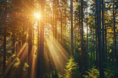 Sunbeams filter through tall trees in serene forest, creating beautiful silhouettes and illuminating lush undergrowth. warm light enhances tranquil atmosphere, inviting peace and reflection
