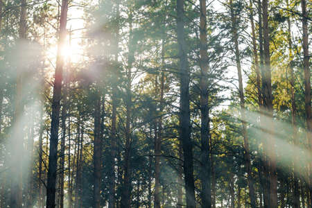 Sunrise in the pine forest with sunbeams in the morning