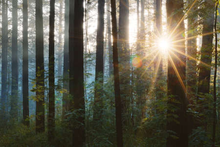 Magical summer scenery in a dreamy forest, with rays of sunlight beautifully illuminating the wafts of mist and painting stunning colors into the trees. High quality photo