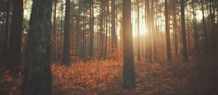 A serene forest scene at sunset, with tall trees and golden autumn leaves, creating a warm and peaceful atmosphere