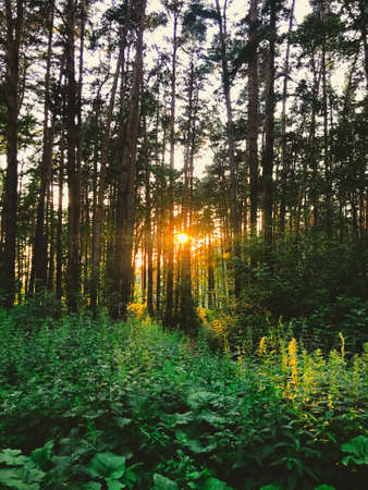 Sunset in the forest. Sunlight in the forest. Sunlight in the forest