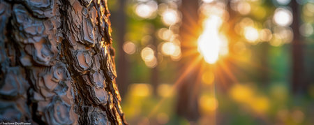 Serene forest scene featuring tall, straight pine trees with sunlight filtering through branches, creating warm and inviting atmosphere. vibrant colors of nature evoke sense of peace