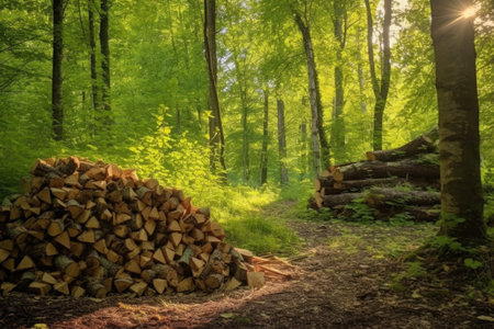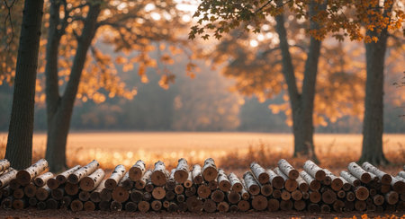 AI Generated. Stacked Logs in Natural Woodland Setting with Golden Fields Nearby