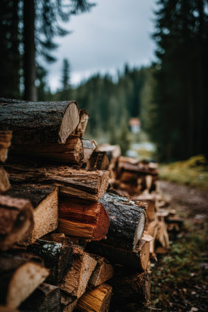 A close-up captures stacked firewood logs, displaying textured wood grain. The logs, a range of browns and grays, are arranged outdoors. The composition features a natural arrangement with some logs partially visible. The scene suggests a rural setting, suitable for illustration in articles.