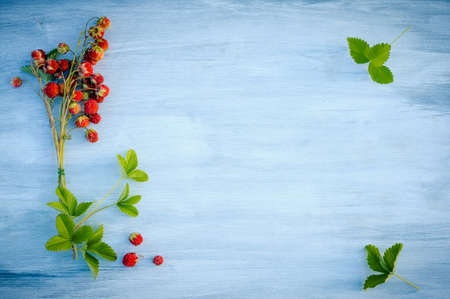 Wild strawberry berries and leaves on wooden background with copy space. Summer background. Concept of summer menu for cafes, medicinal plants and natural vitamins.