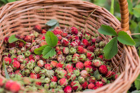 Ripe delicious wild strawberries in a wicker basket, close-up