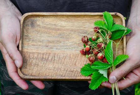 Fresh forest strawberries in the hands.Green leaves on the background.