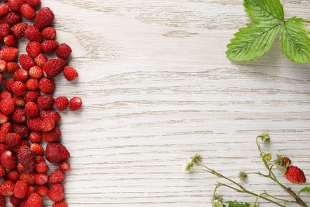 Fresh wild strawberries, flower and leaves on white wooden table, flat lay. Space for text