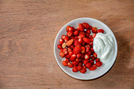 Ripe red wild strawberry in a plate on a wooden table outdoors