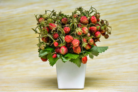 Bouquet of wild strawberry (Fragaria vesca) plants with red ripe fruits and foliage outdoors with wooden boards bacground in sunlight. Taste of summer