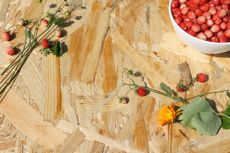 bunch of wild strawberry on a wooden background