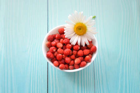 Forest strawberries in white bowl and chamomile flower on light blue wooden background, top view. chamomile and strawberries on table. Summer background. fragrant, fresh and juicy wild berries in sun