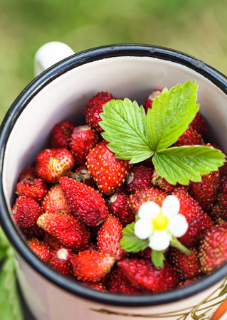 Wild strawberry in the metal cup outdoor
