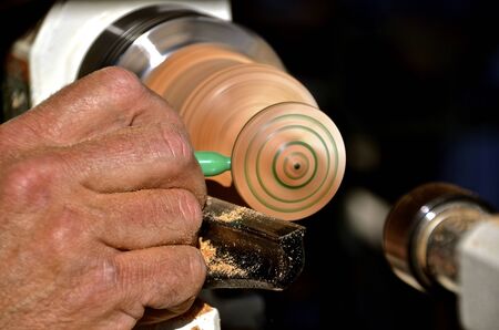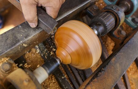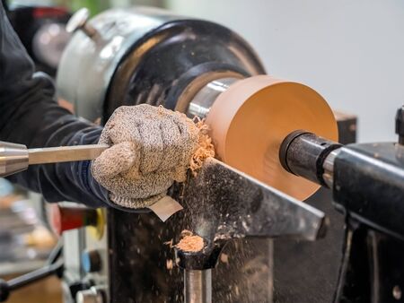 Carpenter man is carving the wooden stick. Spinning wood wheel machine. Trimming forming a round detail. Joiner is using metal tool to make the handmade decoration at workshop.