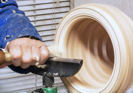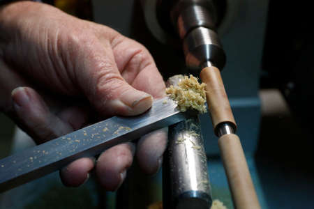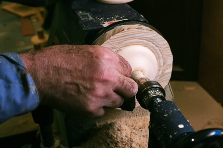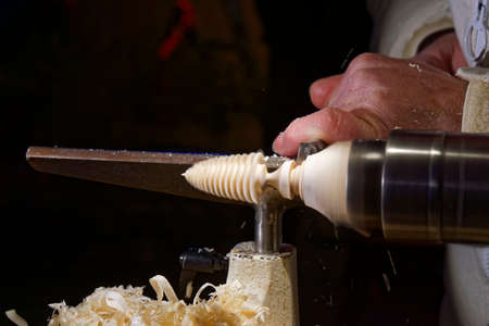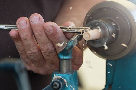 Hand of a Skilled craftsman with the chisel during the work of the WOOD piece with the lathe in the carpentry