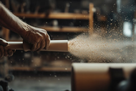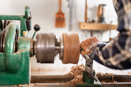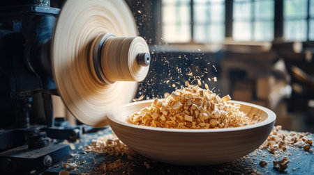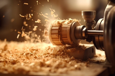 A dynamic view of a woodworking lathe in motion, producing beautiful wooden shavings, showcasing skilled craftsmanship and meticulous attention to detail in a warm workshop atmosphere.