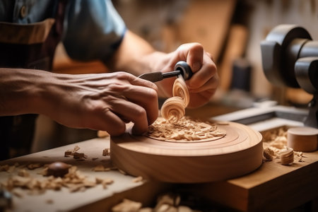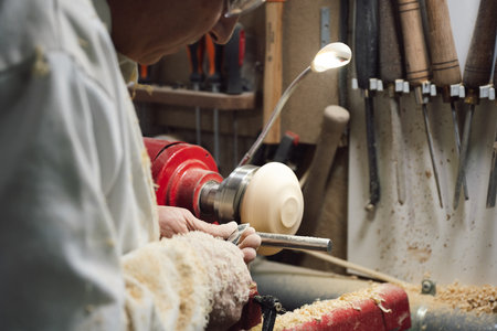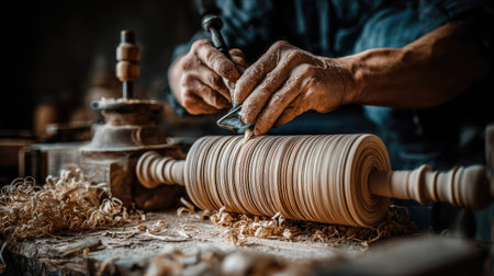Close-up view of a skilled carpenter using a lathe to work with a piece of light-colored wood. Sawdust and shavings are visible on the work table. The artisan's hands are positioned to delicately shape the wood.