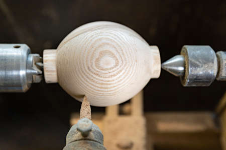 Turning a wooden part on a lathe. Carpentry work. Mechanical woodworking