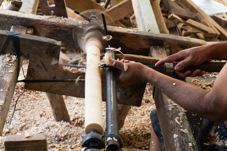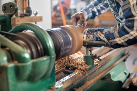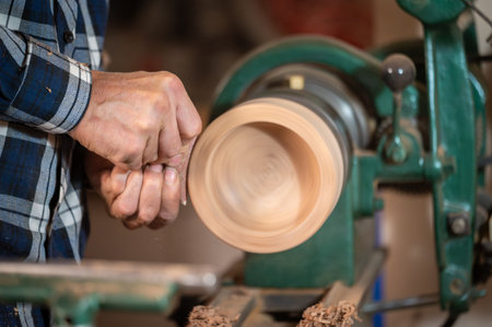 Hands of carpenter turning wood on lathe machine in carpentry workshop