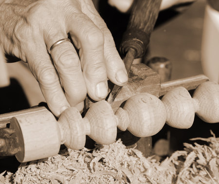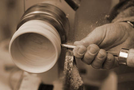 Skilled artisan fingers with wedding ring processing wooden piece with antique lathe and chisel and old toned sepia effect