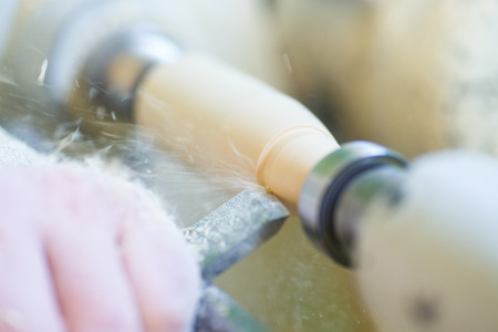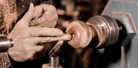 Hands of carpenter turning wood on lathe
