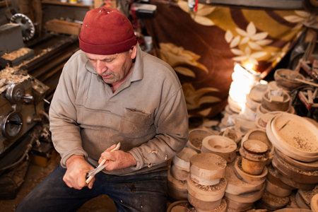 A senior man sitting in the workshop and processing wooden utensils in the old manual way