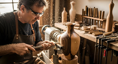 A skilled woodworker shapes a wooden vase on a spinning lathe, with wood shavings flying through the air. The artisan wears safety glasses and is focused on his craft within a detailed, tool-filled workshop.