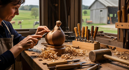 A focused female artisan carves a wooden sculpture using a chisel and mallet at a workbench in her rustic workshop. Wood shavings lie scattered around the piece as she works near a window overlooking a green landscape.