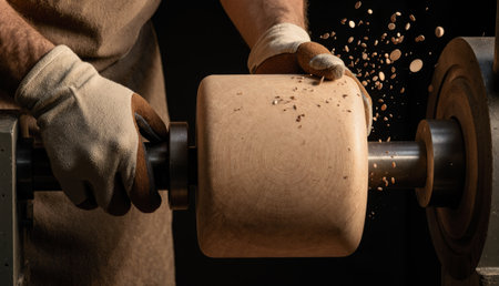 In a quiet workshop, a skilled artisan shapes a block of wood on a lathe. Wood shavings fly as the tool cuts smoothly, creating a beautiful, rounded form under soft light, showcasing craftsmanship.