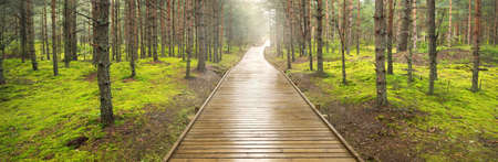 A wooden footpath through the old pine trees. Moss on the ground. Sun rays and morning fog through the tree trunks. Dark forest scene. Latvia